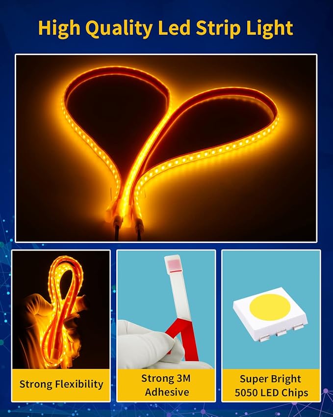 • 【Super Bright】Our 12V auto led light strip is made of high quality ABS Material and 5050 led chips,high luminous efficacy, Long lifespan >50,000 hours,UL approved, it won't get too hot even it works long time.