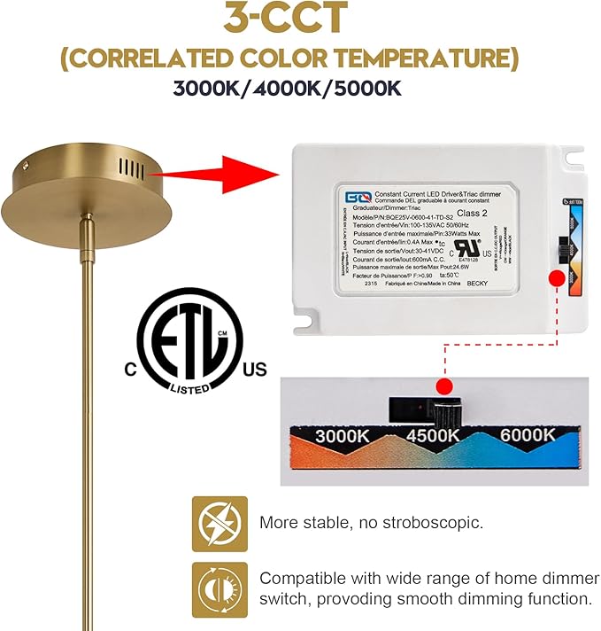 • 【3CCT Selectable】The demand for light in each area of the home space is completely different, this modern golden LED chandelier is more selective in color temperatures. By the 3CCT controller in the canopy, you can select from 3000K/Warm white, 4000K/Neutral white, 5000K/Cool white BEFORE YOU INSTALL THE CANOPY.