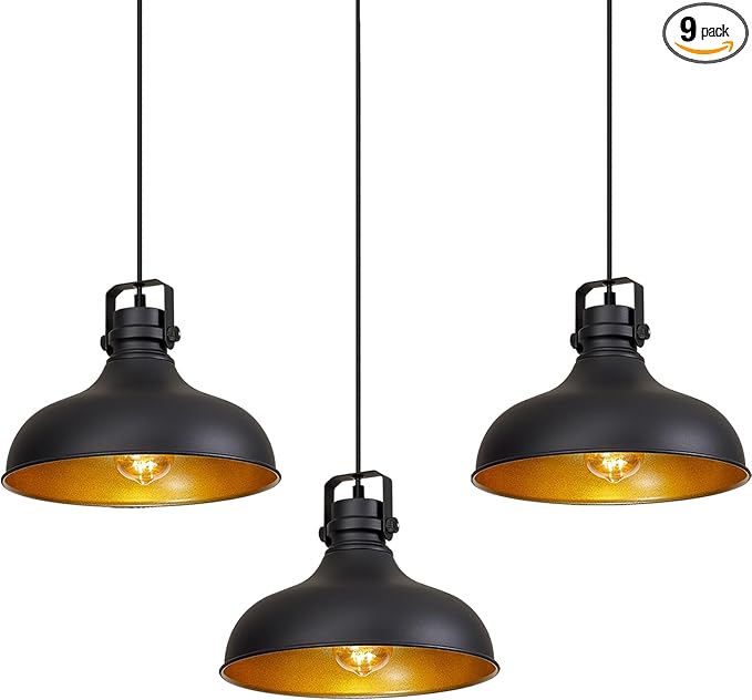 • [INDUSTRIAL & VINTAGE DESIGN]: 3-Light industrial farmhouse pendant light with adjustable cord, mattle black finish featuring retro-style dome shade, this antique pendant lighting is made of sturdy metal construction in black finish and inner gold finish.The vintage pendant lights is ideal for home, dining room, kitchen island, warehouse, entryway, corridor, restaurant, cafe, bar, club, barn, working bench.
