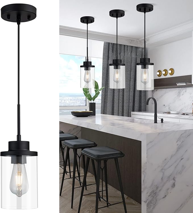 Modern Black Farmhouse Clear Glass Cylinder Pendant Light Fixture, Single Hanging Pendant Lighting for Kitchen Island, Dining Room, Bedroom & Hallway(3 Packs)