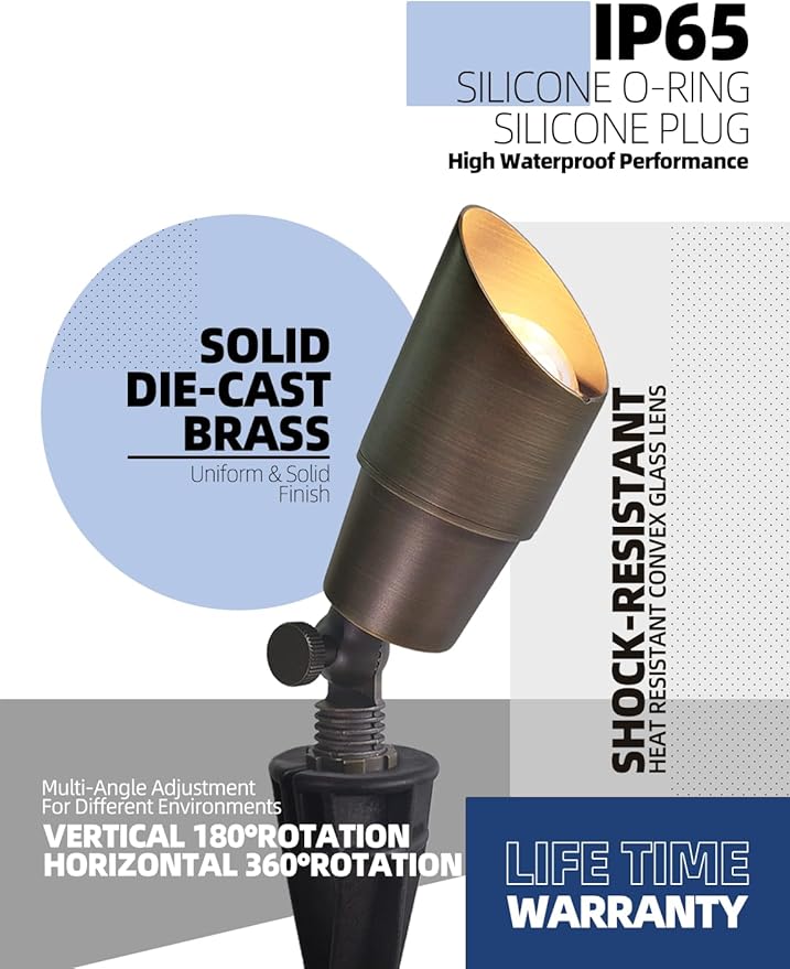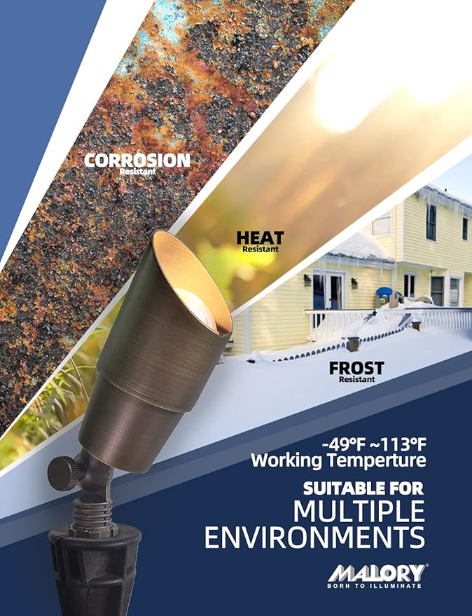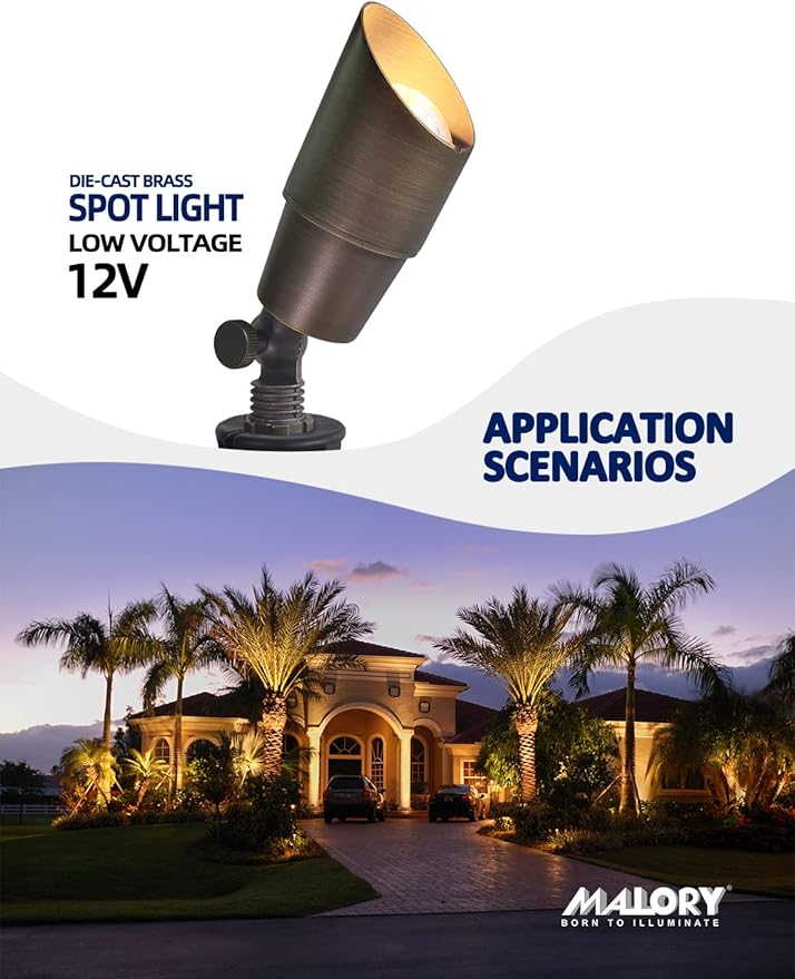 • BRASS LIGHT FIXTURE:MALORY landscape spotlight is constructed of die-cast brass for durability and beauty.Brass spot light doesn't corrode,more durable and reliable than aluminum and plastic fixtures,ideal for any uplighting application.Simple design structure for the light fixture make it looks beautiful yet unobtrusive in any landscape,suitable for decorating most houses and yards.