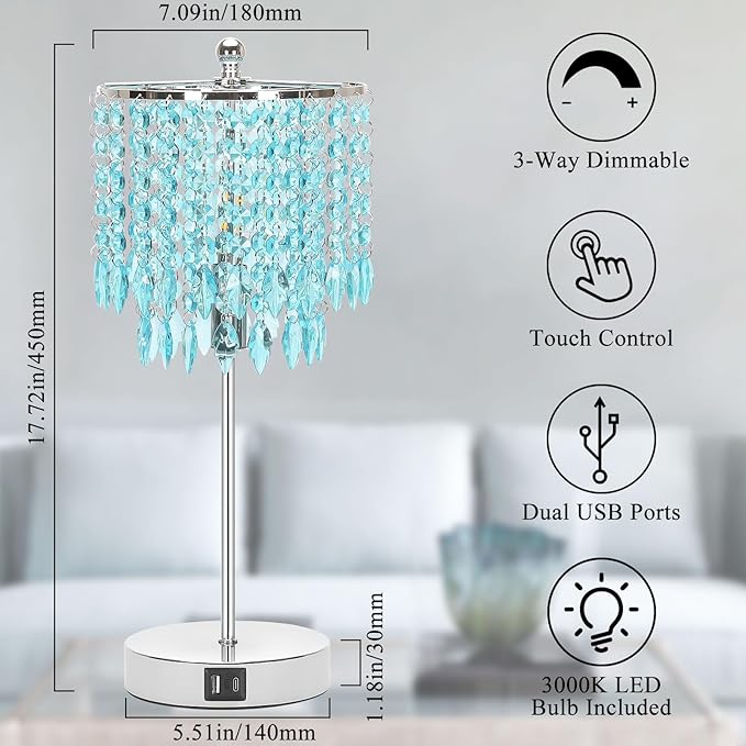 Boncoo Crystal Table Lamp with Touch Control and Dual USB Ports - 3-Way Dimmable Bedside Light with Teal Lamps Shade for Living Room Bedroom, Elegant Home Decor - LED Bulb Included