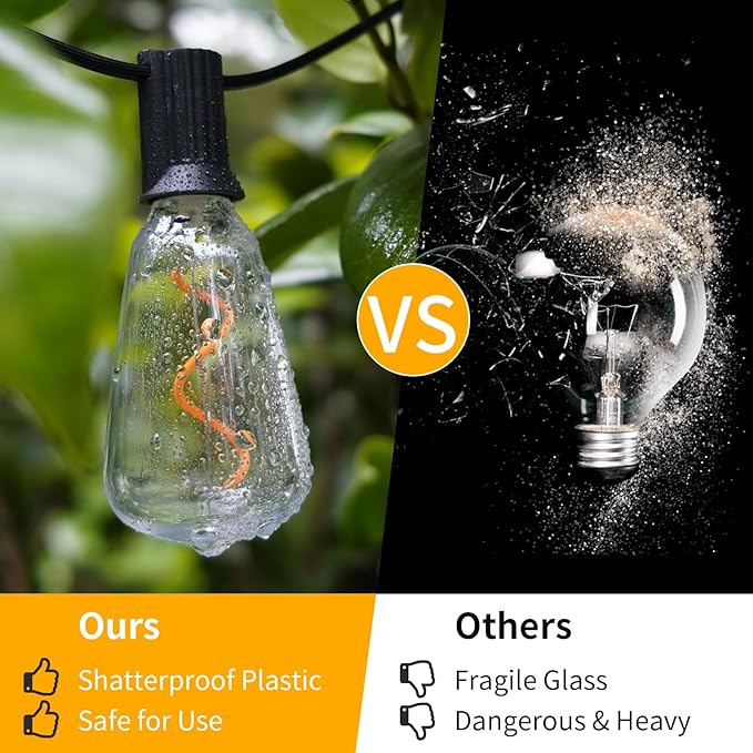 • WATERPROOF AND SHATTERPROOF: ShineU LED ST38 patio lights outdoor waterproof feature a fully sealed waterproof design socket, making the outdoor string lights safe from sun and rain even in the harshest weather conditions.The bulb of our 30FT ST38 outdoor string light is made of plastic. It will not break easily when dropped or blown away by the wind, making it safer to use and keeping you safe from dangerous debris.