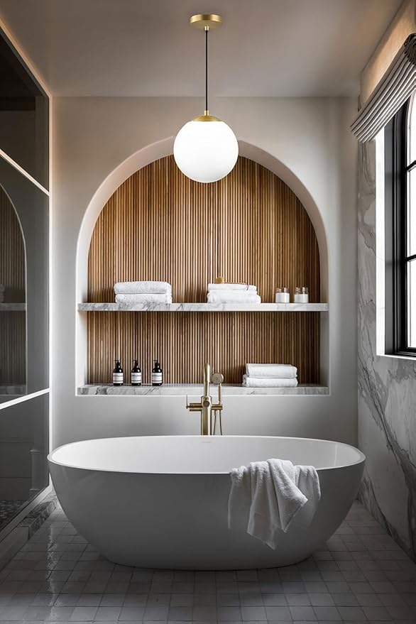 KoKo&Yukina 8 Inch Gold Modern Globe Pendant Light White Glass with Brass Finish Contemporary Mid Century Adjustable Hanging Light Fixture for Living Room Bedroom Bathroom Kitchen (Bulb Incl.)