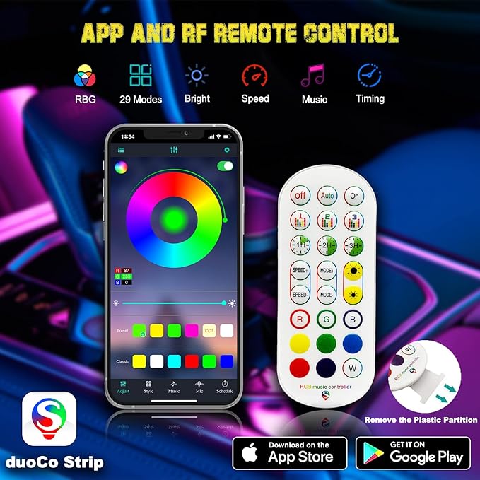 • [App & RF Remote Control]: You can easily control one or multiple sets of lights by APP or remote. Turn lights on or off, dim or brighten, change colors, modes, DIY, timing and even adjust the speed of mode.