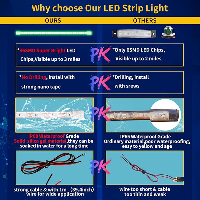 • 【Super Bright】Our Boat Navigation Lights is made of Pure solid silicone Material and super bright chips,high luminous efficacy, Long lifespan >50,000 hours,UL approved, it won't get too hot even it works long time.the brightness is very safe for driving at night.