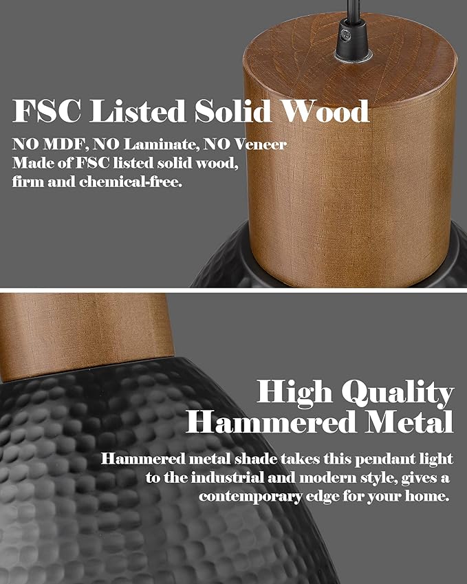 • 👍【Patent Design 2 Pack Pendant Light】①With over 20 years of illumination production experience and a professional design team, we have high strict control over product quality and detail & getting many patents for appearance design and functions at the same time. ② Rubber wood with hammered metal shade set of 2 pendant lights provides a modern industrial feeling. Ideal for kitchen, dining room, living room, office, coffee bar, bedroom. Add this modern industrial looking to your home now!