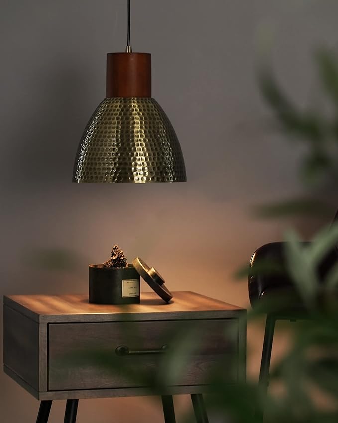 ELYONA 2 Pack Hammered Pendant Light Fixtures, 10.2" Vintage Metal Solid Wood Hanging Bar Lamp, Mid Century Antique Gold Pendant Lights for Kitchen Island, Farmhouse, Dining Room, Brushed Brass