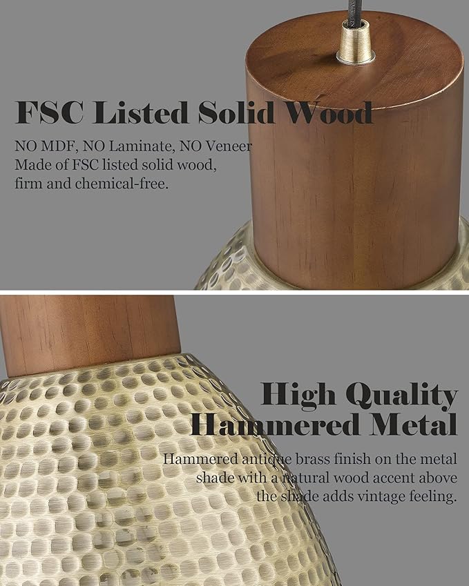 • 👍【Patent Design 2 Pack Pendant Light】①With over 20 years of illumination production experience and a professional design team, we have high strict control over product quality and detail & getting many patents for appearance design and functions at the same time. ② Rubber wood with hammered metal shade set of 2 pendant lights provides vintage industrial feeling. Ideal for kitchen, dining room, living room, office, coffee bar, bedroom. Add this modern industrial looking to your home now!