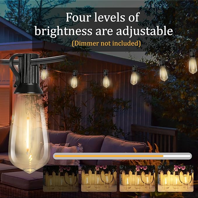• Shatterproof & Dimmable Edison Light String:Led string lights set combines vintage aesthetics with modern functionality. The shatterproof design ensures that the LED bulbs are resistant to breakage, making them suitable for both indoor and outdoor use.Edison lights offer dimmable capabilities(dimmer not included), allowing you to adjust the brightness and create the perfect ambiance for any occasion, whether it's a lively backyard gathering or a cozy evening under the stars.