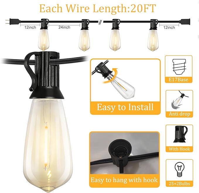 • UL listed&Waterproof: Outdoor string lights have been UL listed that the patio lights have undergone rigorous testing and are safe to use. ST40 led outdoor lights are waterproof, Edison string lights for outside,allowing you to confidently install them in various outdoor settings without worrying about rain or other weather conditions.