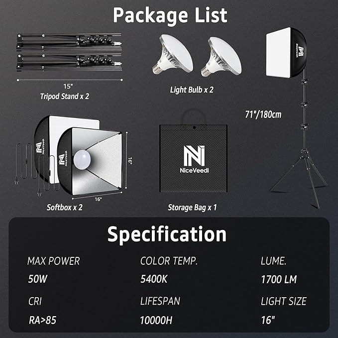 Softbox Lighting Kit, NiceVeedi 2-Pack 16'' x 16'' Softbox Photography Lighting Kit with 63” Tripod Stand & 5400K 450W Equivalent LED Bulb, Continuous Lighting for Photography/Video Record