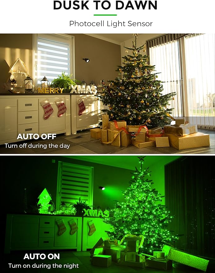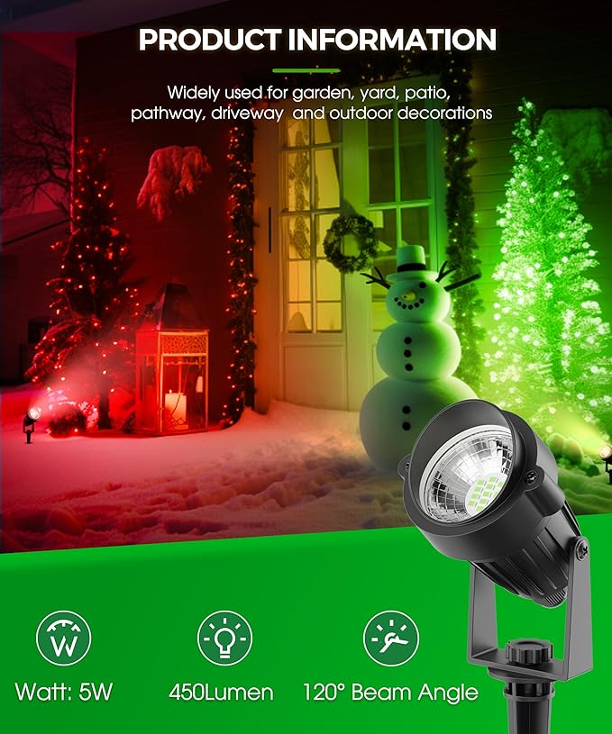 • 🎅IP66 Waterproof Spotlight: Yard patio path green spotlights have excellent performance under rainy and snowy weather. 360⁰ rotatable and 120 ⁰ beam angle of spotlights perfect for lighting up the flags, trees, patio, gallery, studios, gyms,yard, garden, driveway.