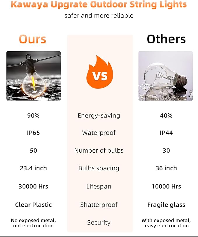• 【IP65 WATERPROOF & SHATTERPROOF】: Kawaya 100FT waterproof string lights for outdoor consists of 50 clear bulbs(+2 spare). IP65 waterproof G40 bulb has a good sealing structure and works well in rainy days. Globe bulbs are made of thick, unbreakable modern plastics, which can stand very high and very low temperatures, not easy to burn out.