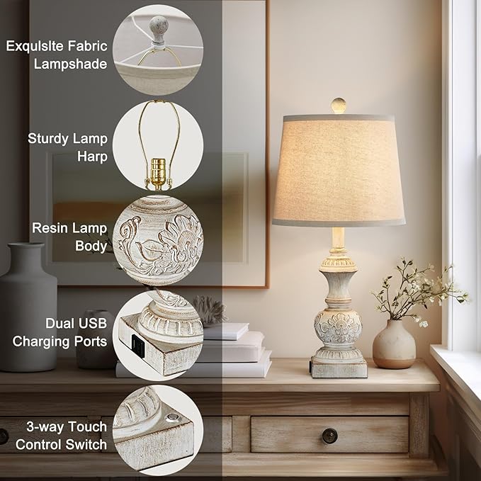 Farmhouse 3 Way Dimmable Touch Table Lamps for Living Room Set of 2 Traditional Rustic Bedside Lamps for Bedroom Nightstand 23.5" Vintage Carved Floral Night Light Lamps with USB Ports Bulb Included