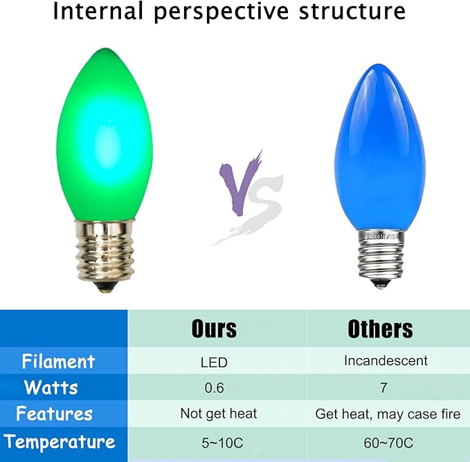 • UL Certified: E17 led bulb c9 outdoor string light replacement bulbs is made of green ceramic shell, UL Listed for indoor and outdoor use. waterproof outdoor led light bulbs are made to withstand the elements. Whether you're decorating indoors or outdoors, they'll hold up against rain, snow, and wind, ensuring your display remains beautiful and safe. Unlike traditional incandescent bulbs, C9 green decorations string light bulbs cool to the touch, so they're safe for use both indoors and outdoors.