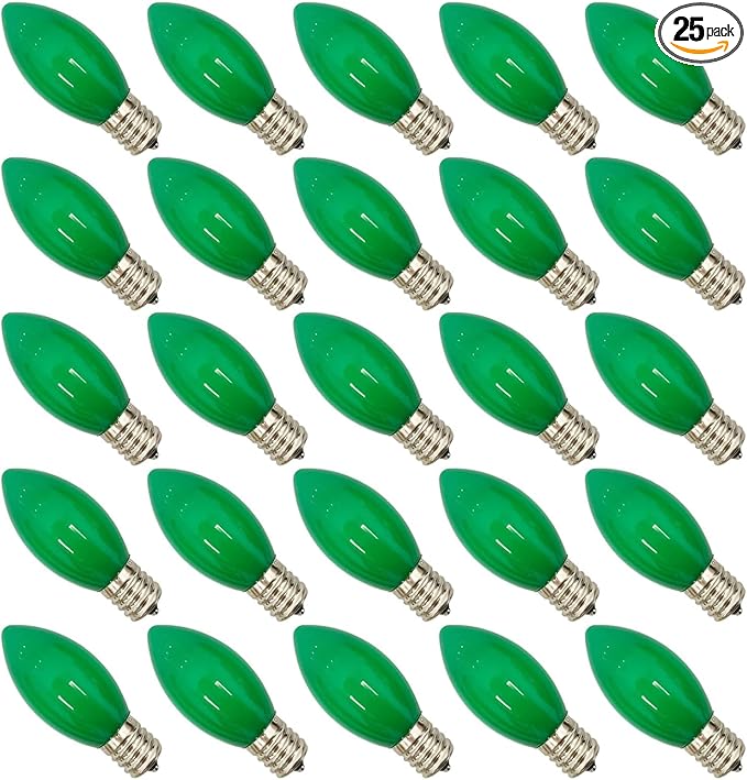 25 Pack C9 LED Green Christmas Light Bulbs, Shatterproof C9 Replacement Bulbs for Outdoor Christmas String Lights, 0.6W LED Night Lights Bulb, E17 Intermediate Base, 2700K Warm White- Green