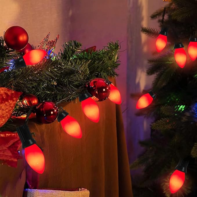 • šŸ’C7 Christmas Light Bulbs: 25 pack red Christmas incandescent bulbs, per bulb is 5 watts, 120 volts, E12 candelabra base. Classic retro shape, ideal for Christmas, Christmas tree, holiday, party, house, patio, garden decoration.