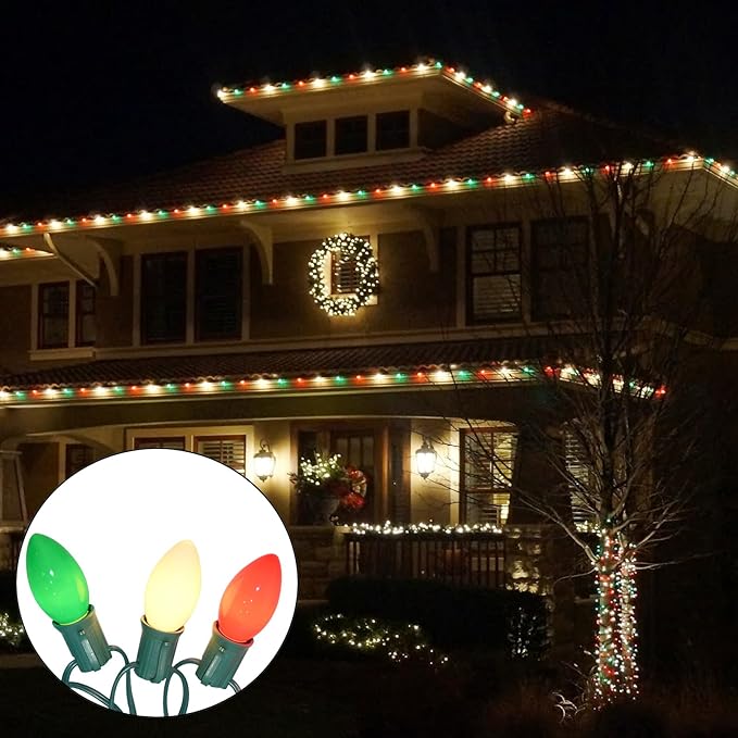 • Outdoor Christmas Decorations: These big bulb christmas lights outdoor string lights feature C9 E17 red and white green bulbs that provide a nice, soft glow that will be eye-catching during your Christmas outdoor decorations.These ceramic christmas tree lights have an old-fashioned appearance,it can add a festival warm atmosphere to your home