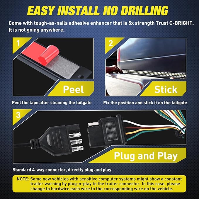 • Widely applicable: this tailgate Light Strip is 48 inches long and is suitable for most pickups, trailers, truck, towing vehicle, cars, SUV, RV, Van, etc. NOTE: If there is a warning when plugging into the trailer port, please connect the car light wiring follow the line sequence