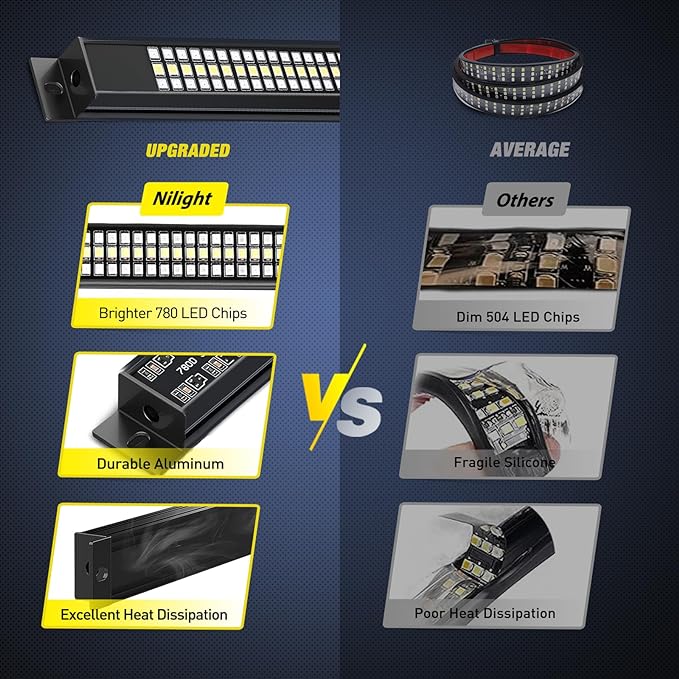 • Aluminum frame super bright: 48” tailgate light bar has triple row led chips, each row with 260 super bright LEDs, a total of 780 SMD 2835 LED chips with high quality, efficient output and lumen can easily light up your travel path, ensure your safety at day and night
