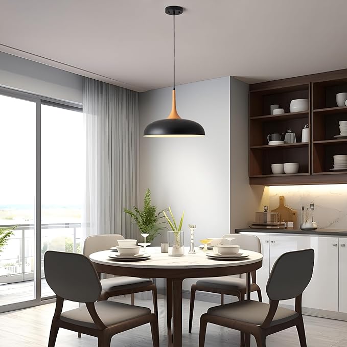 • Farmhouse Design Style: VIOlOEMI farmhouse pendant light is aesthetically pleasing in design. Its Scandinavian and minimalist design features a black bowl shade with a faux wood grain top (Not made of wood), adding a touch of elegance to any space. The contrasting colors and textures create a sleek and rounded look that is impressive and can easily blend into a variety of interior styles