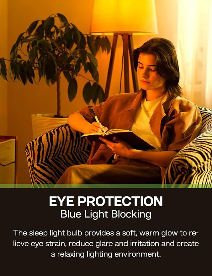 • 【1200 LM Warm Light】- Sleep light bulbs 1200 lumens soft warm light, no flicker, no glare, CRI 85+, let your eyes read and work in a more comfortable environment, effectively protect your eyesight and relieve eye fatigue