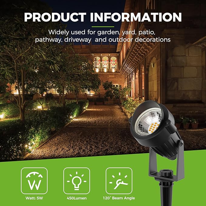 • Auto On/Off Landscape Lighting: Built-in sensitive dusk to dawn sensor, the outdoor landscape lights automatically turn on at night and turn off during the day. 450LM 5W led spotlight add brilliance to the appearance of your home and save money.(!!!Note: Because the light sensor is in the head of the lamp, the orientation of the head will affect its sensing of brightness, and it will go out when it senses that the surroundings are bright enough.)