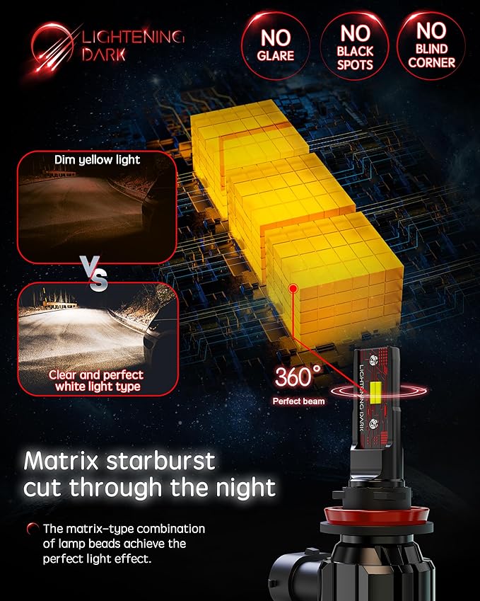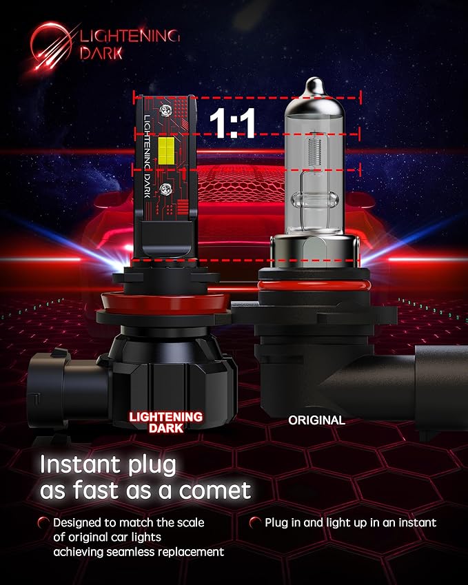 • [Easy installation]: LIGHTENING DARK light bulb designed to match the scale of original car lights, also fit for ATV/UTV powersports light. Restore wireless instant plug design, no need to modify the dust cover of the original car, achieve quick replacement in 10 minutes. Smaller, simpler, and more convenient