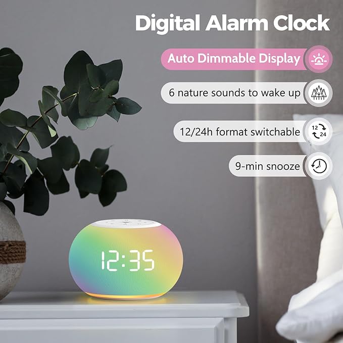 • Auto-Dim alarm clock and sound machine with night light combination device. The upgraded driver offers 30 volume levels for precise control and noise-blocking capabilities. Wake up to gentle nature sounds.