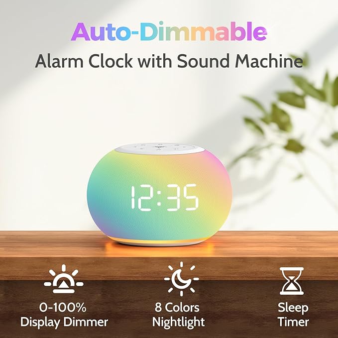 Reacher Auto-Dimmable Alarm Clock Sound Machine with Night Light, 20 Soothing Sounds, Auto-Off Sleep Timer, Precise 30-Level Volume, Small White Noise Machine for Adults, Bedrooms