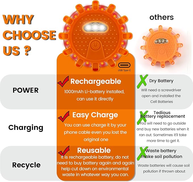 USB-C Rechargeable LED Road Flares Emergency Lights-Large Capacity (Lithium Battery) 3 in 1 Cable Roadside Warning Car Safety Beacon Flashing Disc Kit with Magnetic Base for Vehicles