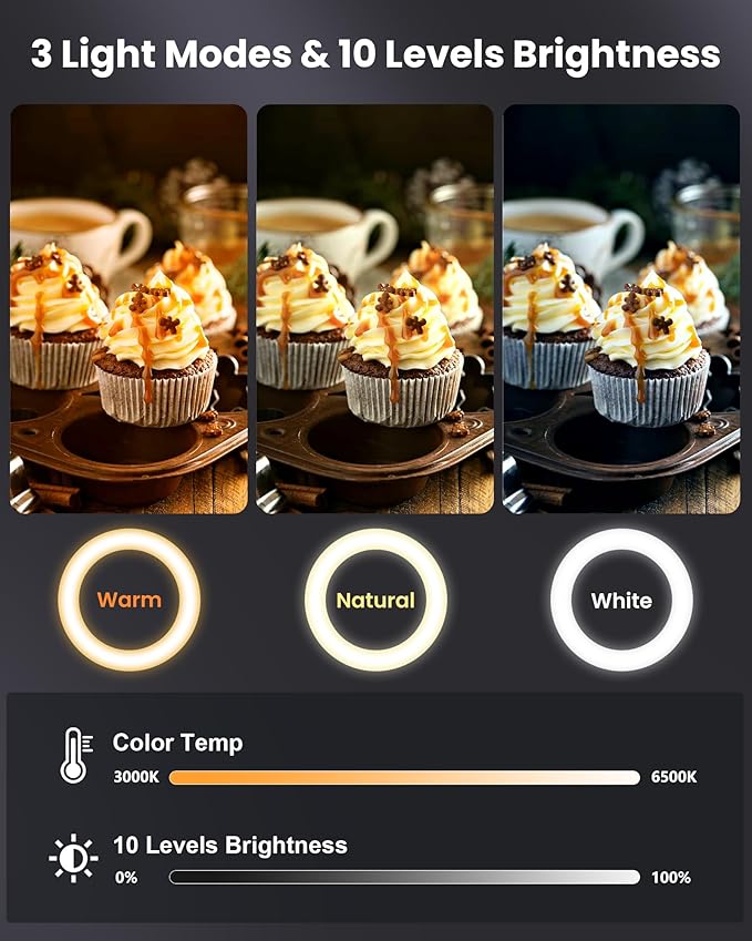 • Pro-Quality Lighting with 30 Settings: Customize your lighting with 3 color modes (Warm, Natural, Cool), each with 10 brightness levels. A high CRI (>95) ensures vibrant, true-to-life colors—It's a must have video equipment for YouTubers, TikTokers, and content creators