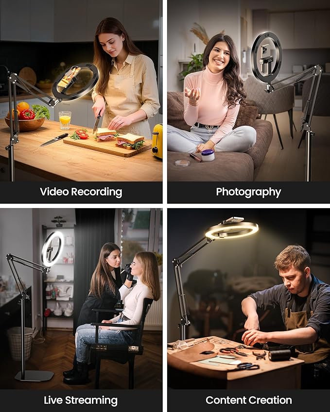 • All-in-One Ring Light for Any Space: This 2025 upgraded ring light tripod for iPhone combines the flexibility of an overhead light with the stability of a floor stand. No clamps or bulky tripods required—set it up easily in your kitchen, living room, bedroom, or studio. Perfect for content creators who need pro lighting without workspace limits