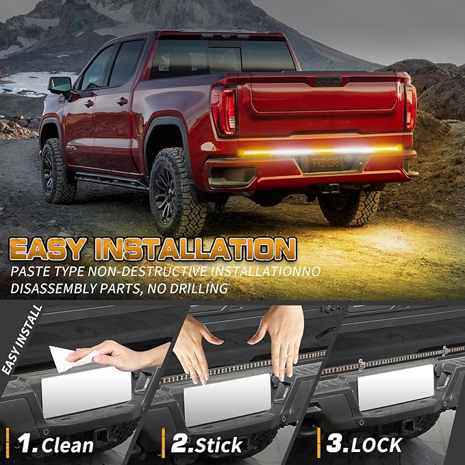 • 【EASY TO INSTALL】No need to drill, just clean and wipe the mounted surface and peel and stick the tailgate strip lights by using high viscosity self-adhesive tape for secure installation. Strong adhesive and clear locks ensure stable installation.