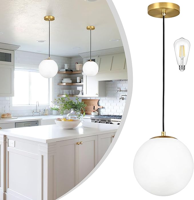 KoKo&Yukina 10" Globe Pendant Light Gold Mid Century Pendant Light Glass Globe Mid Century Modern Light Fixture Brushed Brass Finished with Milk Glass Lampshade for Dining Room Bedroom
