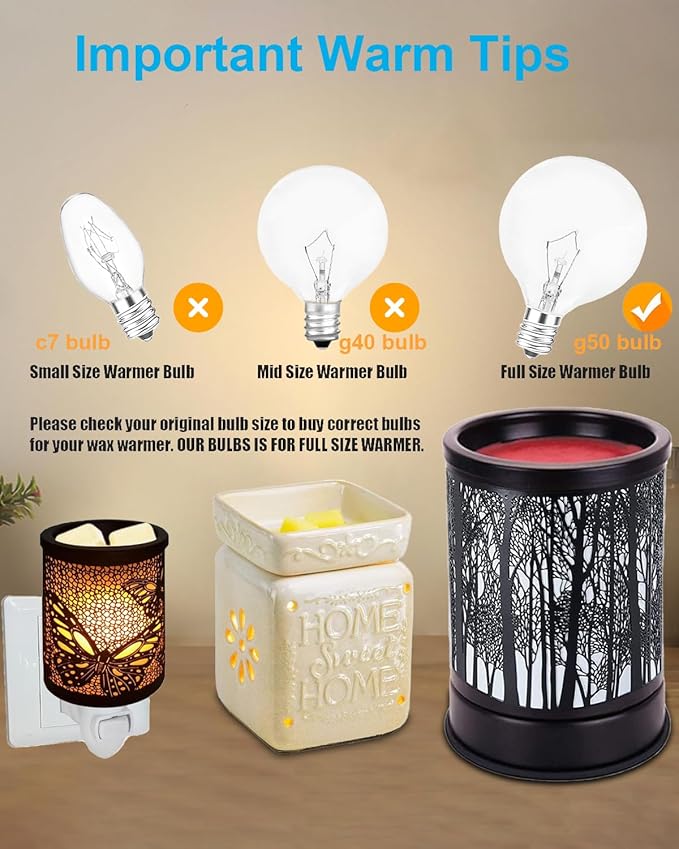 • Excellent Fully Dimming Performance : Wax warmer bulbs are designed for use in fragrance warmers, providing an even melt for wax in saucers. You can control the melting speed by adjusting the bulb's brightness. The brighter the bulb, the faster the wax melts, allowing you to customize the fragrance intensity. This makes it an ideal choice for wax melting devices.
