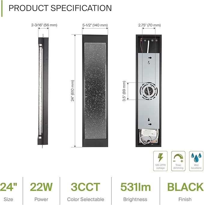 ASD LED 24" Bubble Glass Wall Light Fixture, Outdoor & Indoor Seeded Sconce | 3CCT, Waterproof, Dimmable, Up-Down Glow, ETL Listed | 22W 530LM 3000-5000K 100-277V | Porch Lighting | Black, 2 Pack