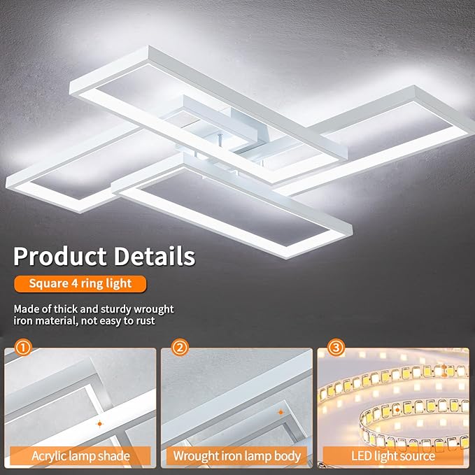 • 👍 POWERFUL LIGHTING EFFECT: Equipped with high brightness LED light source, the square 4 ring ceiling light fixture can provide bright and comfortable lighting effect. Whether you use it in the living room, bedroom or office and other spaces, it can provide enough light to meet the needs of daily life and work.