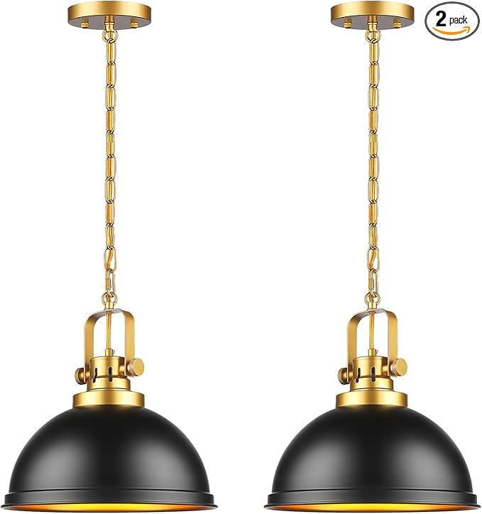 2-Pack Black Gold Pendant Lighting, Farmhouse Metal Pendant Lights Modern Matte Black Dome Industrial Light Fixture for Kitchen Island Restaurant Dining Room Hallway Entrance