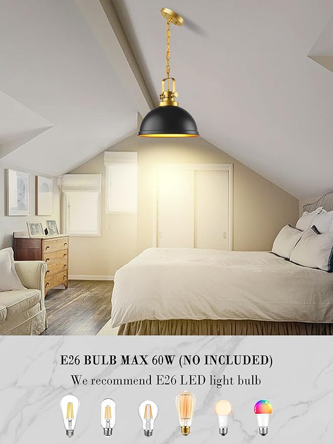 • ⭐【Bulb Requirement】This black pendant light fixture is compatible with incandescent, LED, CFL, and halogen bulbs with E26 sockets (standard USA sockets and 60W Max). It is also suitable for use on a dimmer switch providing the bulb used is also dimmable. Note: The Bulb and Dimmer Switch Not Included.