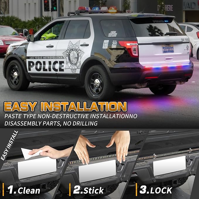 • 【EASY INSTALLATION】No need to drill, just clean and wipe the mounted surface and peel and stick the law enforcement lights by using high viscosity self-adhesive tape for secure installation. Strong adhesive and clear locks ensure stable installation.