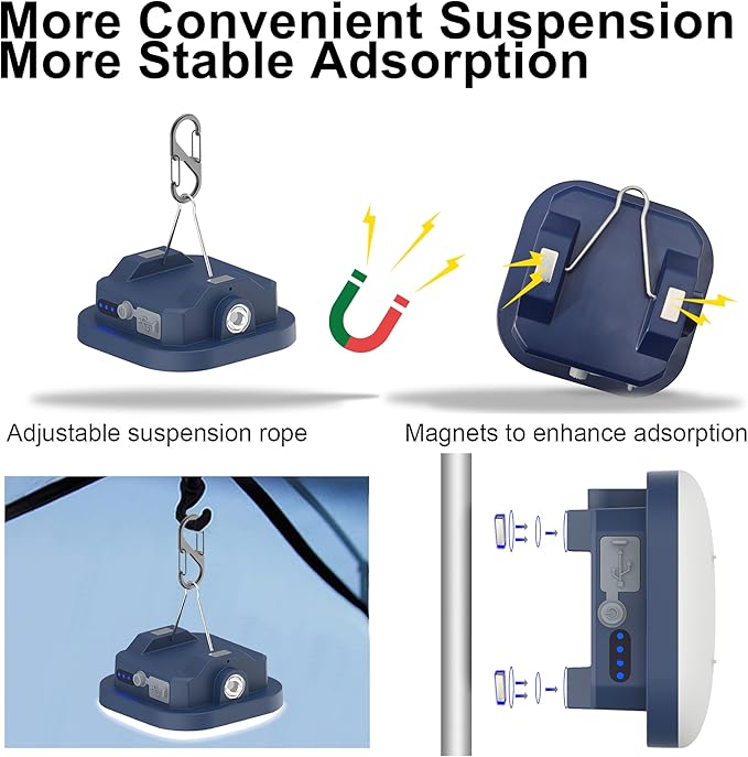 • 【Convenient to use】This portable camping light comes with one detachable strap hooks,carabiner and magnet, at the base that can hang the tent light upside down to get better light when lighting up a big area.The Improvement magnet could adsorbed on any surface of metal.