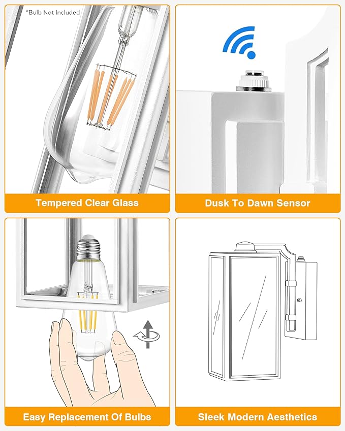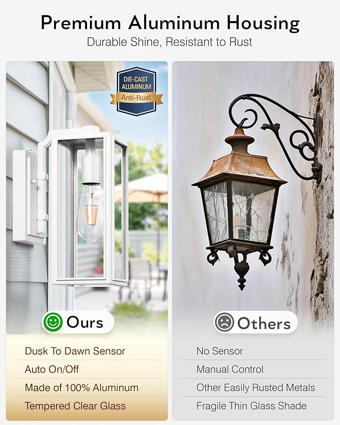 • 👍[Automatic Dusk to Dawn Functionality] Transform your outdoor area with the VIANIS White Wall Mount Outdoor Light! This eco-friendly light is equipped with a photocell sensor that activates at sunset and deactivates at sunrise. Say goodbye to electricity waste and hello to convenience and security—all while saving money!