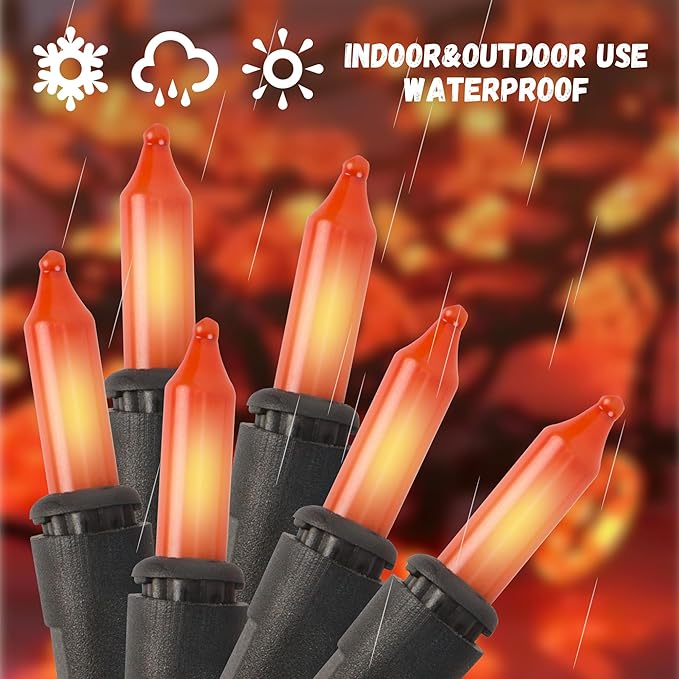 • Halloween Orange Lights String: Boasting 21FT length with 100 orange incandescent bulbs placed at a 4" spacing.The commercial grade 22 AWG wire with a black copper core ensures durability, making orange string lights suitable for both indoor and outdoor use.The black wire seamlessly blends with any decor, allowing the orange glow to take center stage without overwhelming the overall ambiance.The wire of orange lights for Halloween in black is really nice,especially for Halloween decorations!