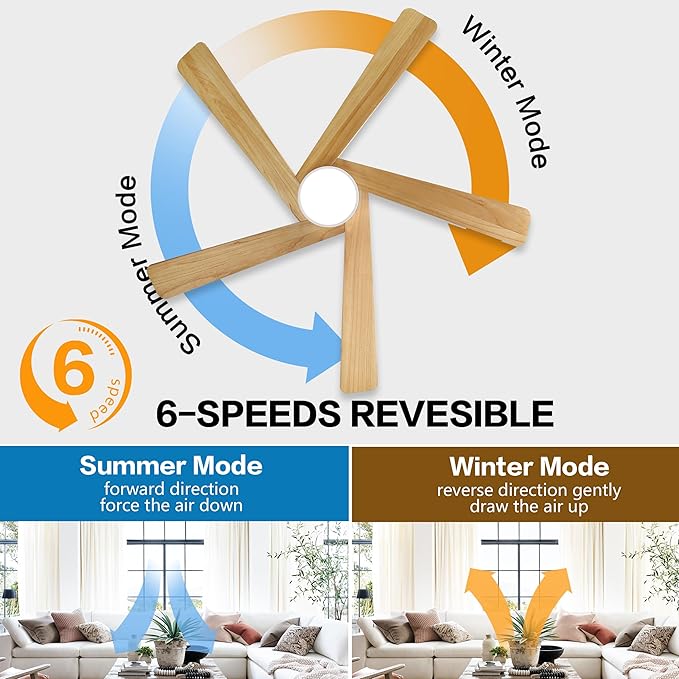 • QUIET & REVERSIBLE: The powerful ceiling fan with lights operates on 6 forward and reverse speeds (easy to adjust with the included handheld remote). In the cold winter months, reverse the fan’s motion to draw the cold air upwards to warm up your spaces.