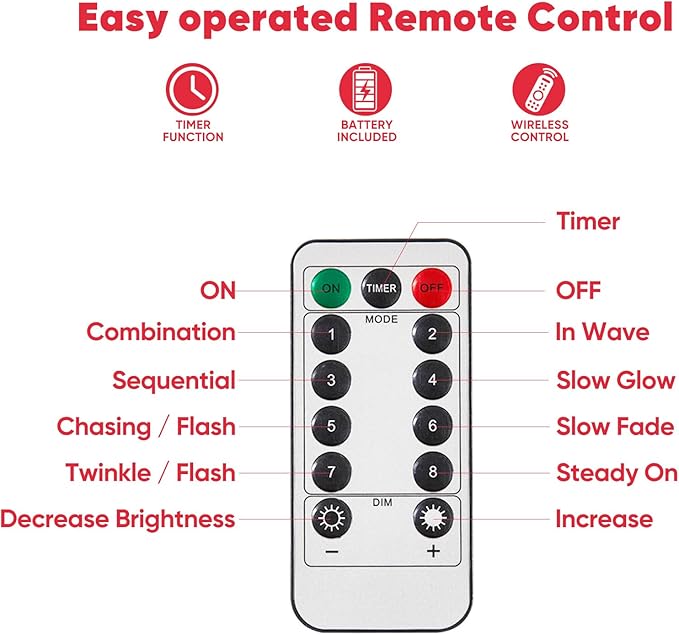 • Remote Control Convenience: Easily switch between 8 unique lighting modes and adjust brightness with the included remote; features timer for automatic 6 hours on, 18 hours off cycle.