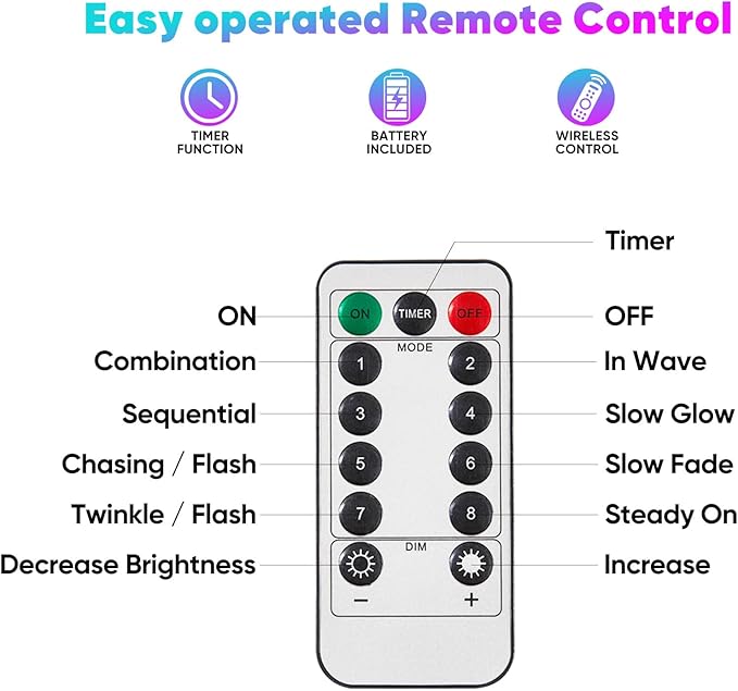 • Remote Control Convenience: Easily switch between 8 unique lighting modes and adjust brightness with the included remote; features timer for automatic 6 hours on, 18 hours off cycle.
