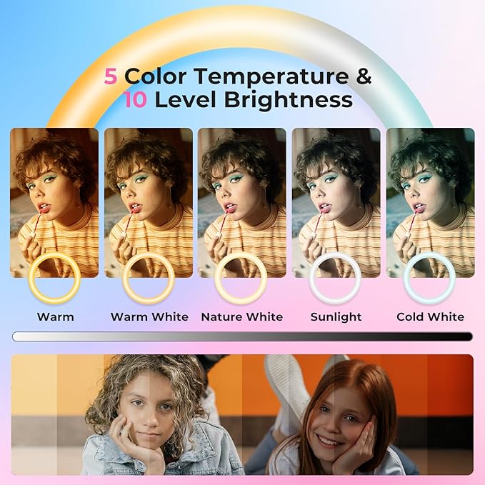 • User friendly Touch Control: Our LED ring light provides 5 colors (warm, warm white, nature white, sunlight, cold white) and 10 brightness (10%-100%) to meet your various needs. It features a highly sensitive touchpad to control the lights. Which will be more convenient and have longer life than traditional mechanical buttons.