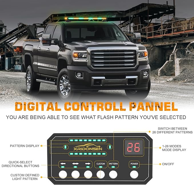• UPGRADED CONVENIENT CONTROL PANNEL - Equipped a digital display controller to turn on/off, change modes between 26 flashing patterns, 3 quick selection of directions and a favorite CUSTOM pattern. You can always know what pattern caution lights is running.